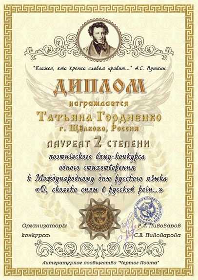 Стихи.про присоединяются к этим словам и от души поздравляют блестящего автора нашего сайта Татьяну Гордиенко! Желаем ей новых вершин и крылатого полёта вдохновения.