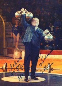 Подбежавшие клоуны откинули верхние полусферы и из «цирковой штанги» посыпались униформисты, воздушные гимнастки, ассистентки... Общий вес «цирковой штанги» явно превышал полтонны. Публика встала, приветствуя богатыря. На арену полетели цветы. А он стоял в центре, освещённый лучами прожекторов, и всё так же смущённо улыбался, прижимая к груди испачканные магнезией руки...