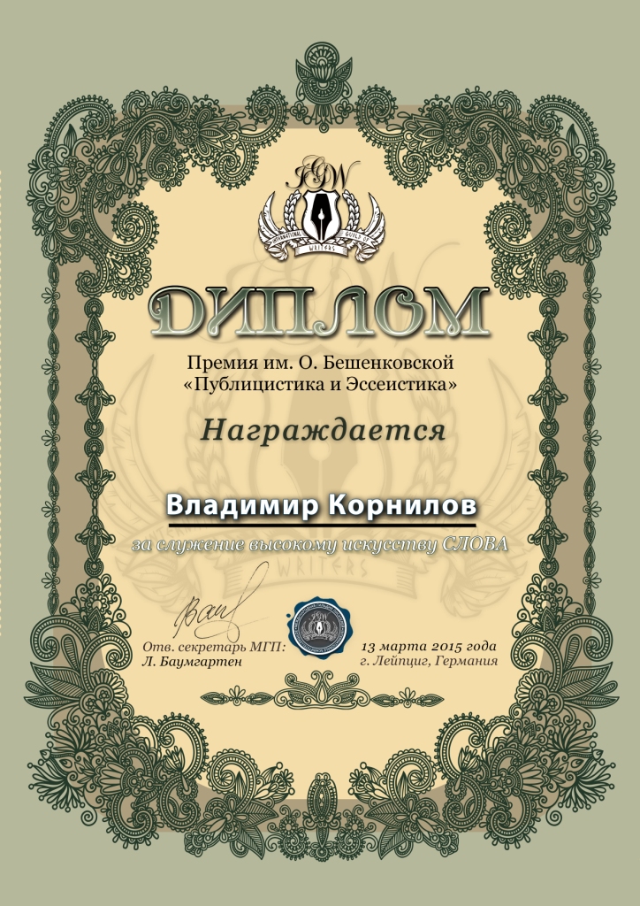 Сайт и все его авторы поздравляет Владимира Корнилова с такой значительной победой, как прорыв на международную арену. Горячо гордимся им и желаем его книгам долгой жизни и народной любви. Пусть пишется и пишется! Новых замечательных творческих работ, книг и побед!