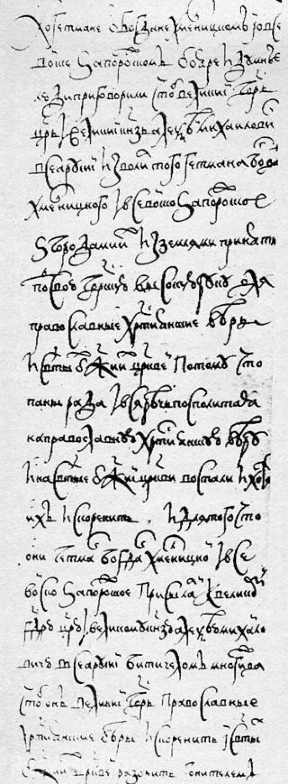И они у Царского Величества запорожские черкасы милости просят со многим слезным челобитьем, чтоб он, Великий Государь, православные христианские веры искоренить в святых Божиих церквей разорить гонителем их и клятвопреступником не дал и над ними умилосердился, велел гетмана Богдана Хмель-ницкого и все войско Запорожское принять под свою государеву высокую руку. А будет Государь их не пожалует, под свою государеву высокую руку приняти не изволит, и Великий бы Государь Его Царское Величество для православные христианские веры и святых Божиих церквей в них вступился, велел их помирити через своих государевых великих послов, чтоб им тот мир был надежен. А собою они с поляками мирится отнюдь не хотят, потому что поляки в правде своей не стоят.